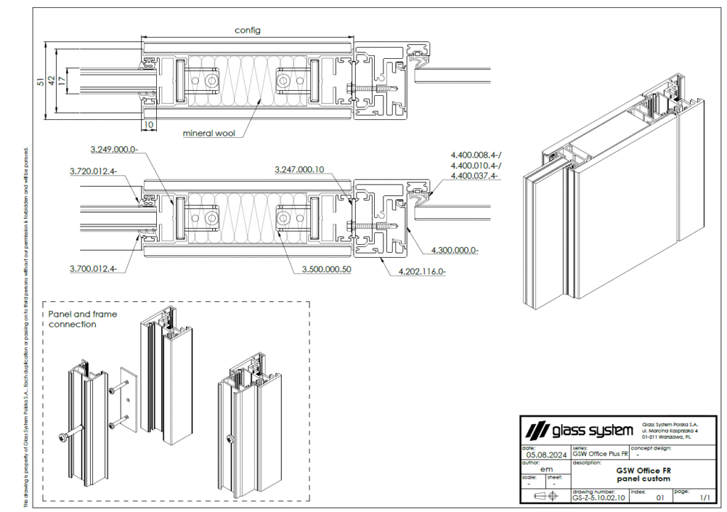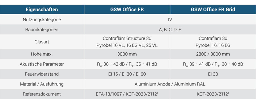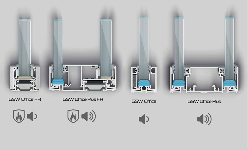 Je nach verwendeter Glasart können die Wände einen Feuerwiderstand von EI 15 bis EI 60 aufweisen. Die Notwendigkeit, Brandschutzglas zu verwenden, bedeutet jedoch keinen Verzicht auf akustische Parameter – alle Verglasungsvarianten im System GSW Office FR wurden Labortests unterzogen, die hohe Isolationsparameter gegen Luftschall bestätigten – RW bis zu 42 dB.