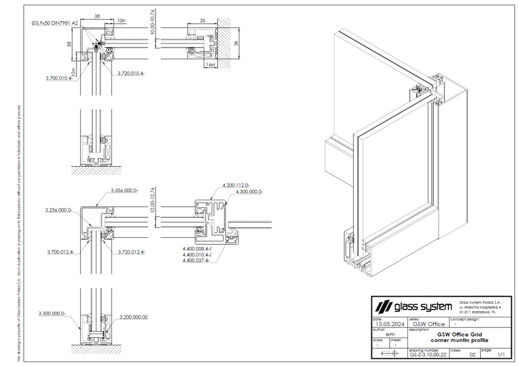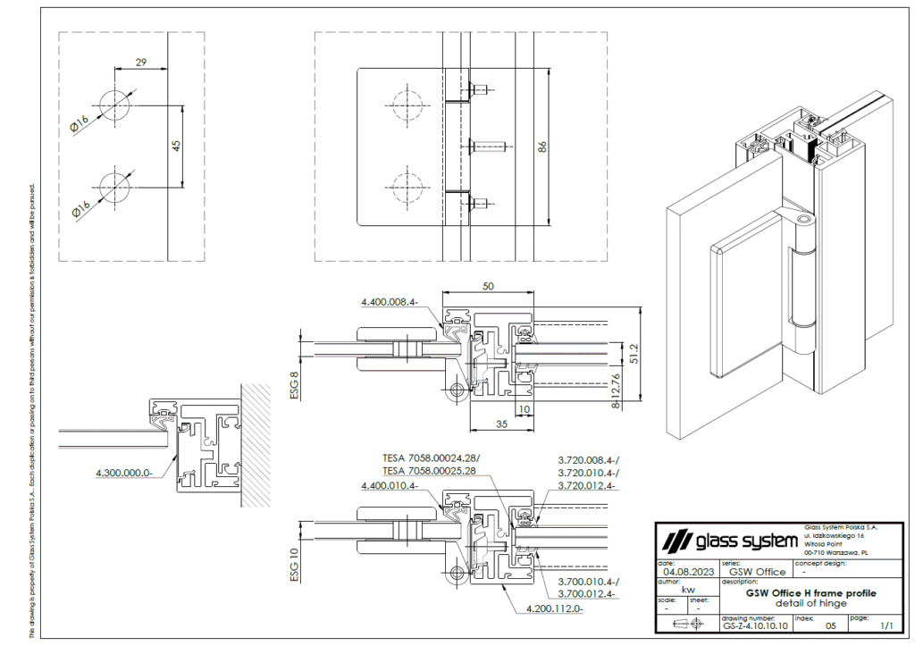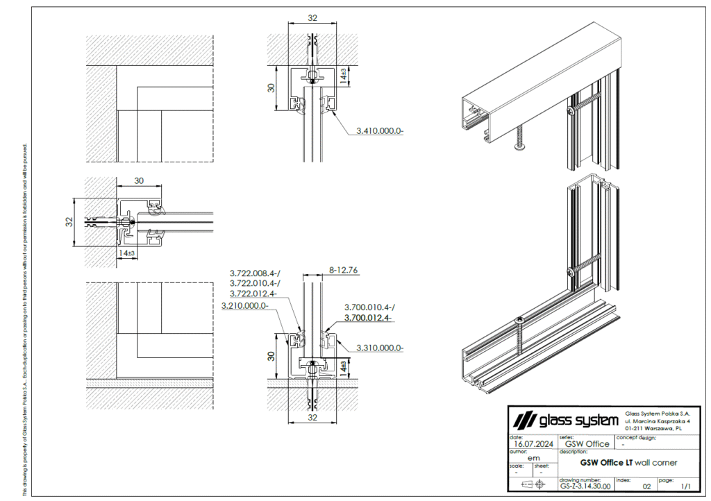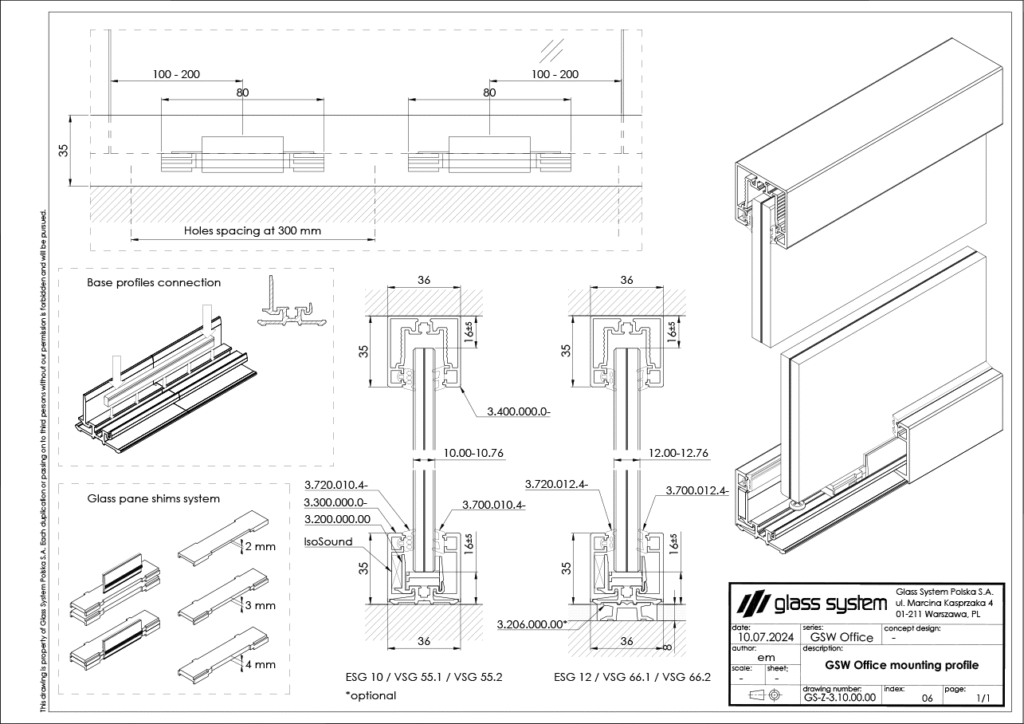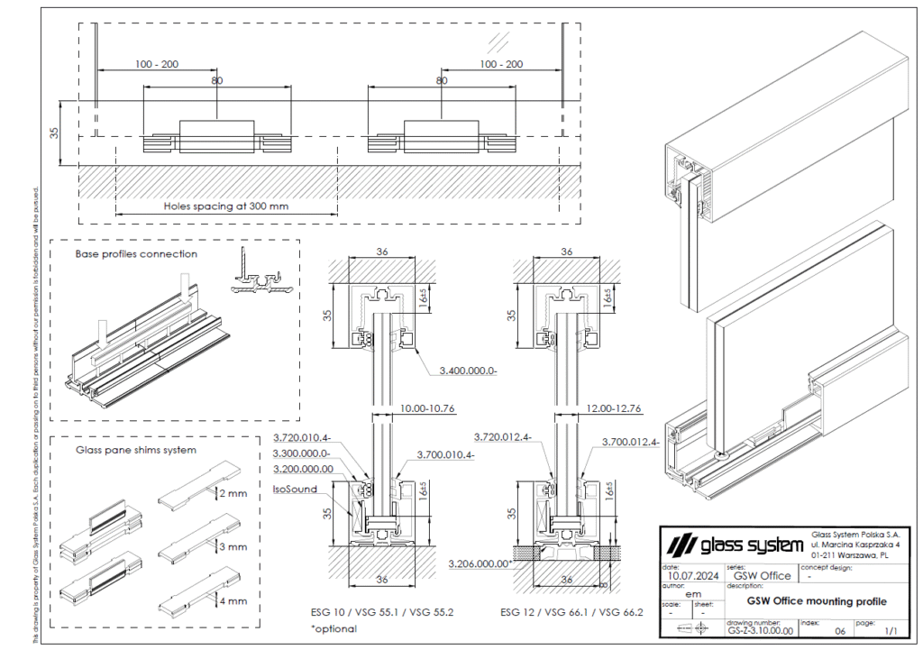 Das gebogene GSW-Office-Profil ermöglicht den Einbau jeder Art von gebogenem Glas, das im System verwendet wird, aber der Eckbiegeradius erfordert immer eine Beratung vor der Umsetzung.