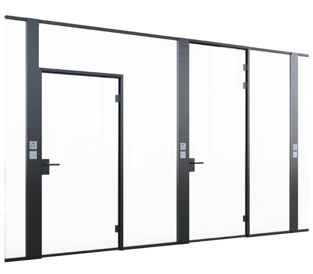 Berührungsempfindliche Lichtschalter, Zugangskontrollen oder eingebaute Tablets und vieles mehr, perfekt abgestimmt auf unsere GSW Office Türrahmenfamilie.