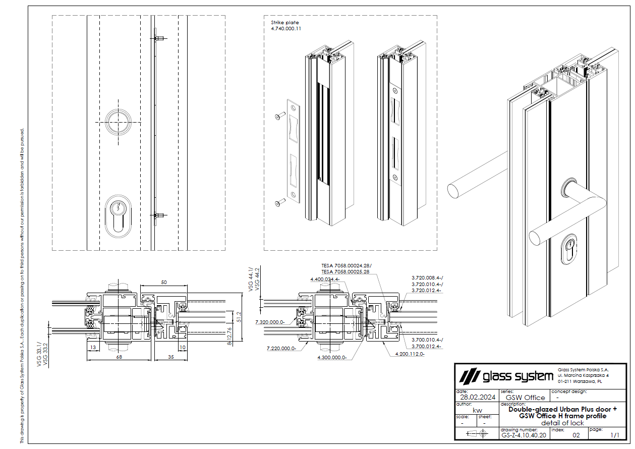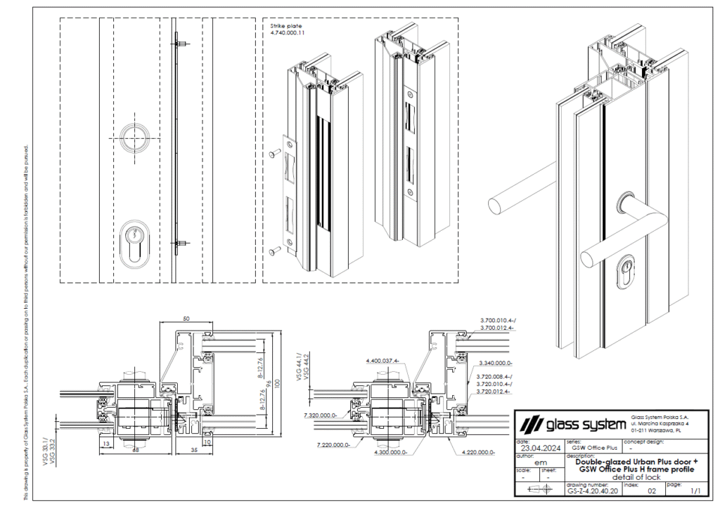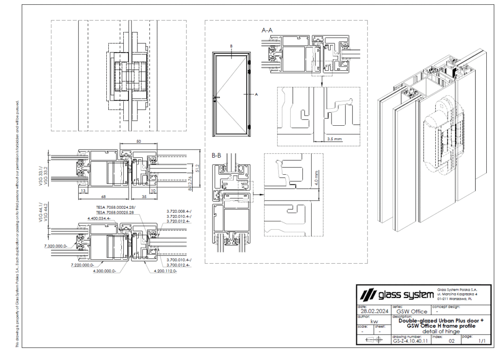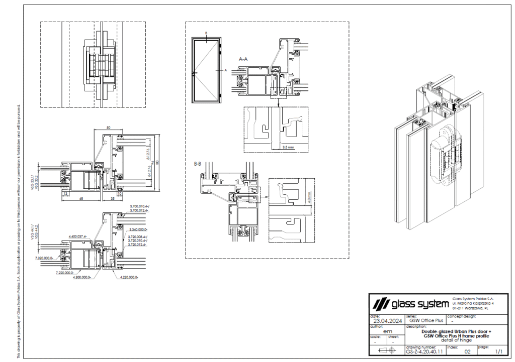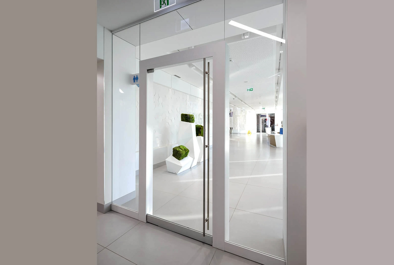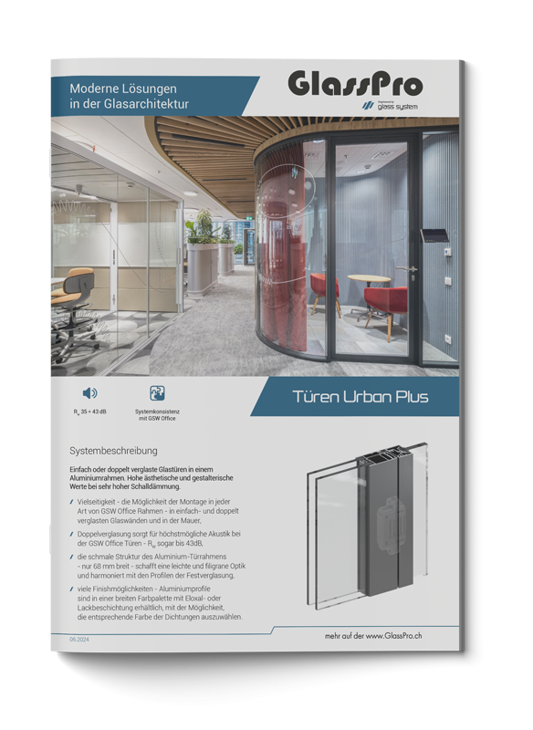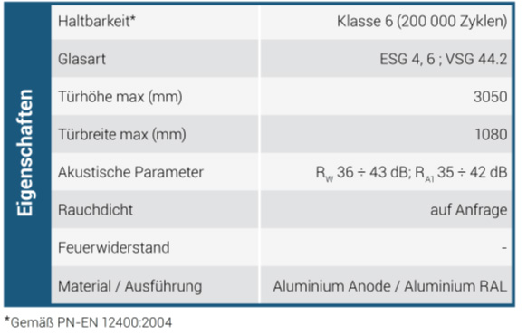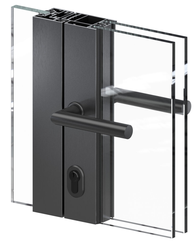 Einzel- oder Doppelglastür im Urban Plus Aluminiumrahmen. In der doppelt verglasten Variante ermöglichen sie eine sehr hohe Schalldämmung – RW bis zu 43 dB. Die Konstruktion des Flügels in beiden Versionen ermöglicht es, die gleichen hohen ästhetischen und strukturellen Werte im Höhenbereich von bis zu 3000 mm zu erzielen.