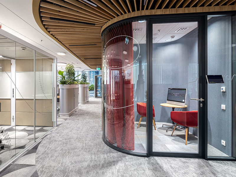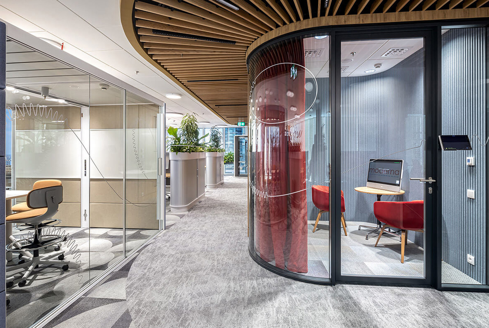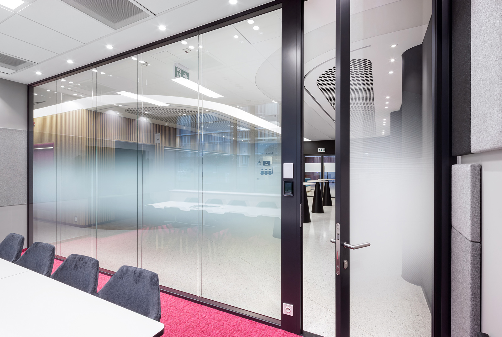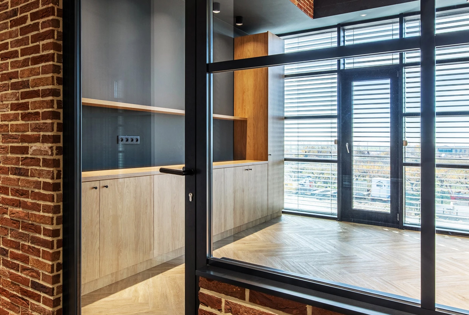 Türen in Aluminiumrahmen mit Doppelverglasung sind die ideale Lösung für alle, die Ästhetik und Funktionalität suchen. Dank ihrer sehr hohen Schallabsorption bieten sie eine hervorragende Schalldämmung und sind damit die ideale Wahl für Konferenzräume. Integrierte Scharniere, Schlösser und eine Falldichtung garantieren Stabilität und Komfort. Außerdem schützt ihr robuster Rahmen das Glas vor mechanischer Beschädigung, was sie nicht nur schön, sondern auch langlebig und praktisch macht.