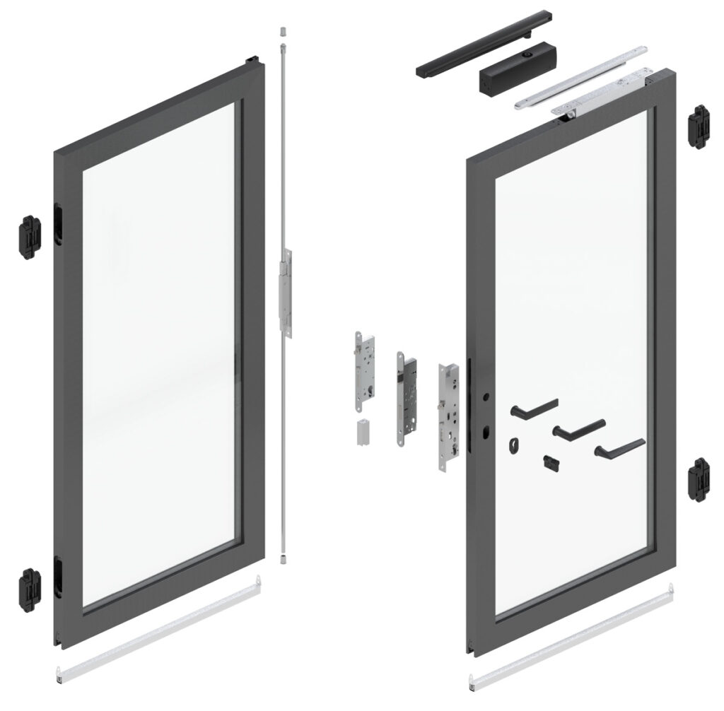 Urban Plus-Türen sind in vielen Varianten erhältlich. Sie können eine Einzeltür oder eine Doppeltür mit einem Stehtflügel sein, sowie eine Loft-Version mit Sprossen. Dank ihres Profils ist es möglich, einen Türschließer zu integrieren, auch in der Panik-Version für Doppeltüren.